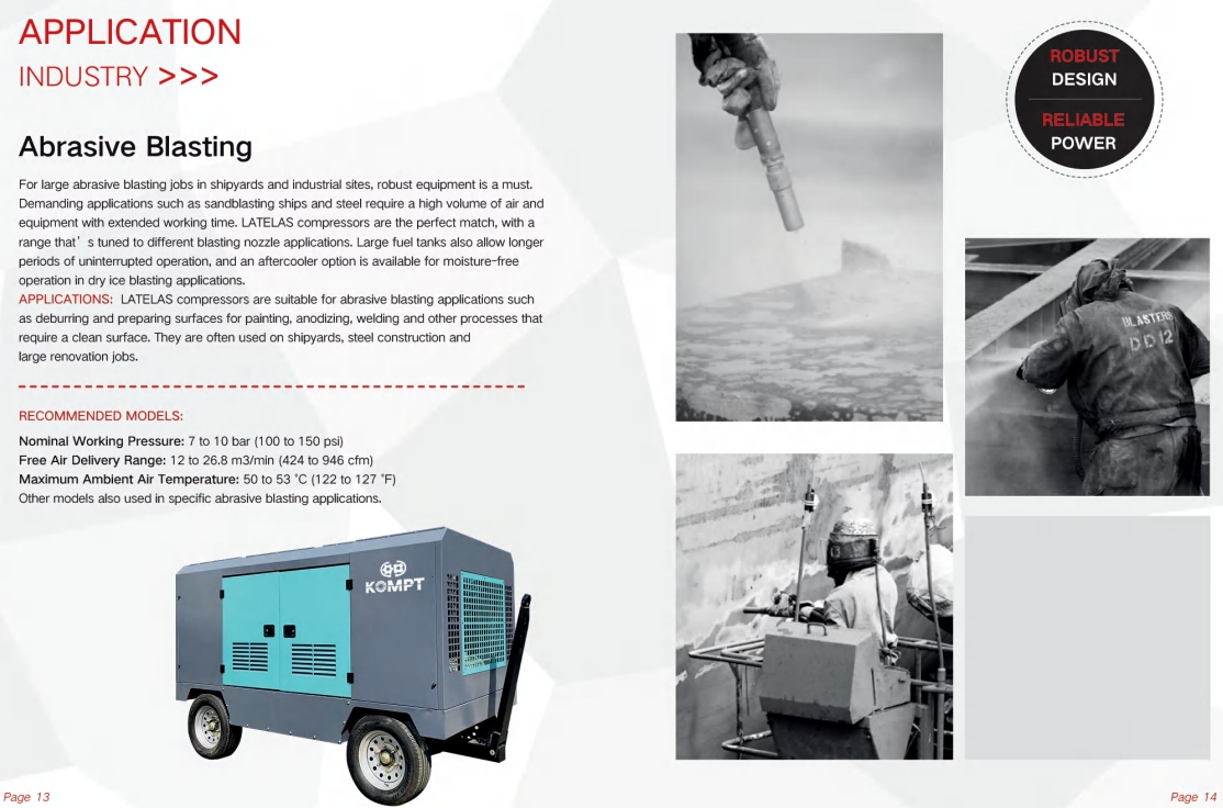 APPLICATIONS: LATELAS compressors are suitable for abrasive blasting applications such as deburring and preparing surfaces for painting, anodizing, welding and other processes that require a clean surface. They are often used on shipyards, steel construction and large renovation jobs.